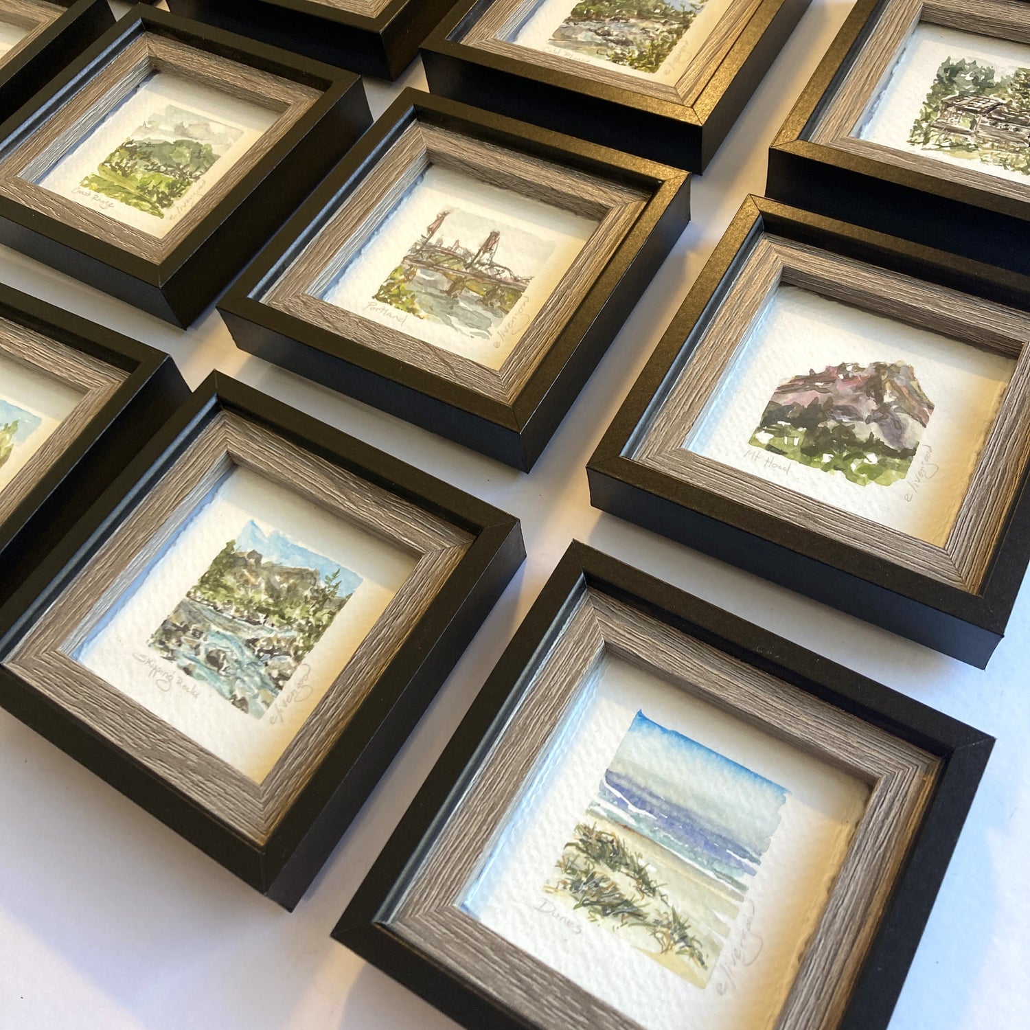 Bite sized original, framed gouache (opaque watercolor) paintings.
