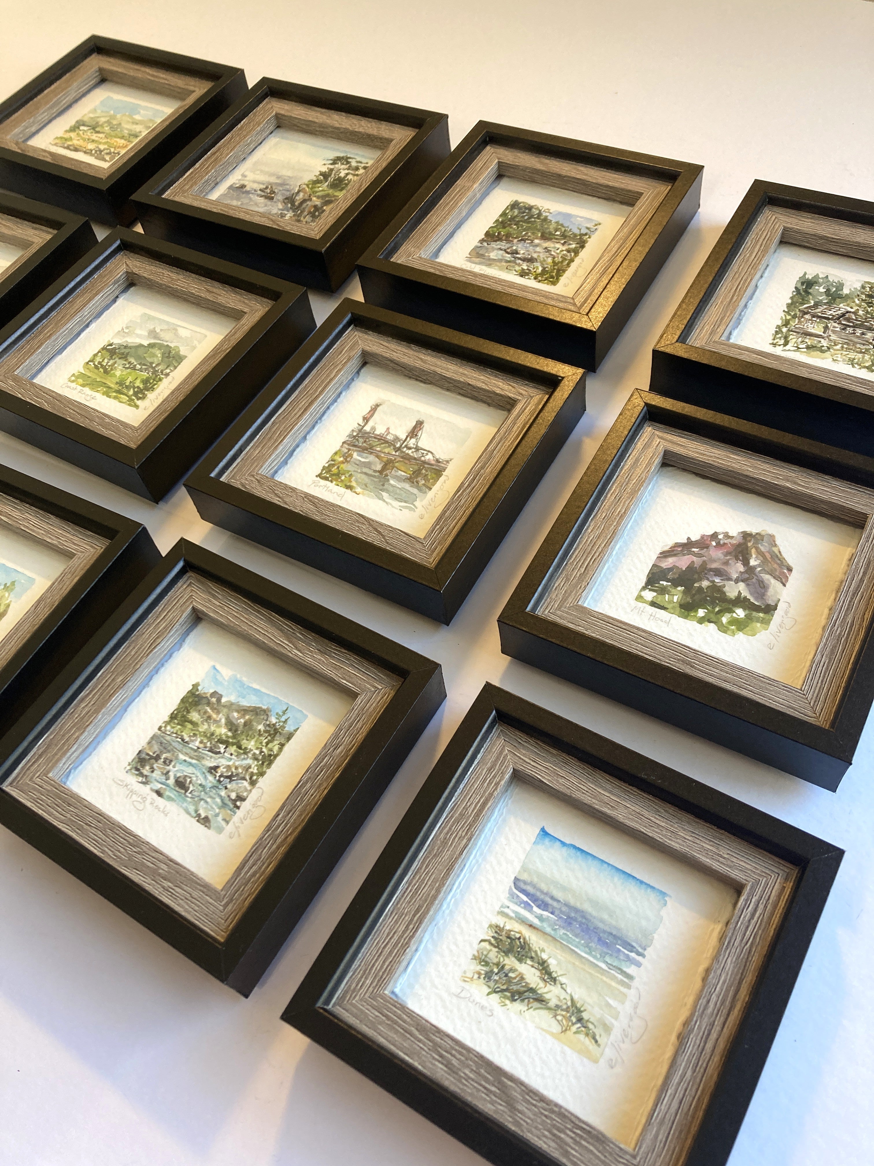 Bite sized original, framed gouache (opaque watercolor) paintings.