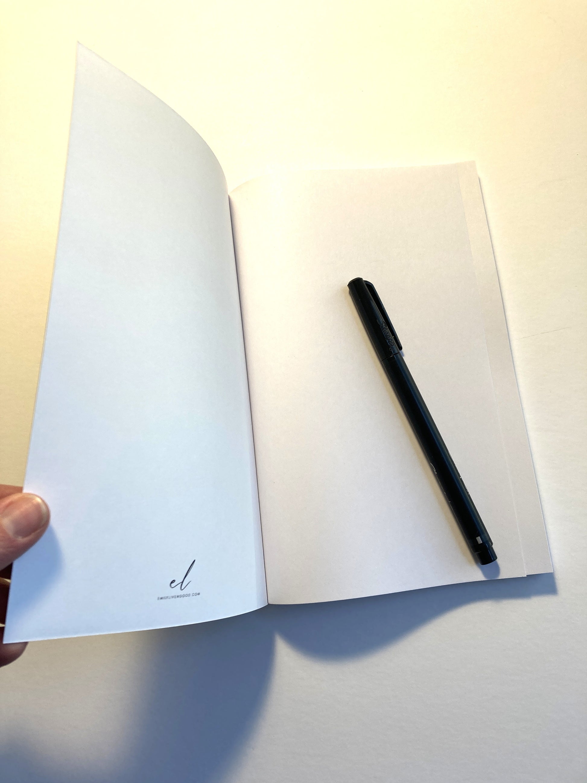 The cover is velvety smooth to the touch and water resistant. The layflat binding with 144 blank pages are perfect for journaling or sketching. Includes a small Emily Livengood Art logo on the back and inside cover. (Pen only for scale and not included!)