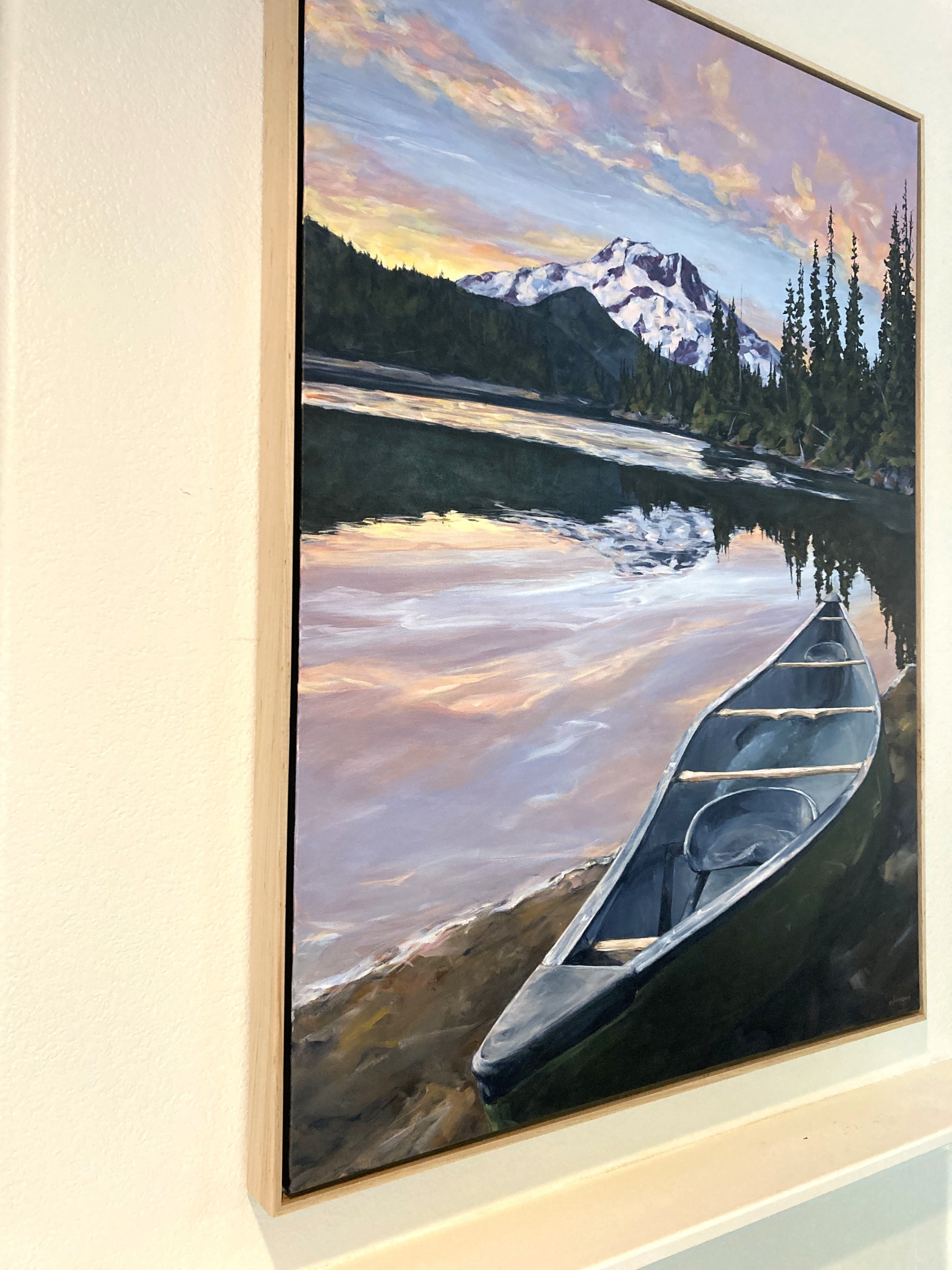 The painting is framed in a beautiful 2.5 inch deep maple float frame with wire hanger.