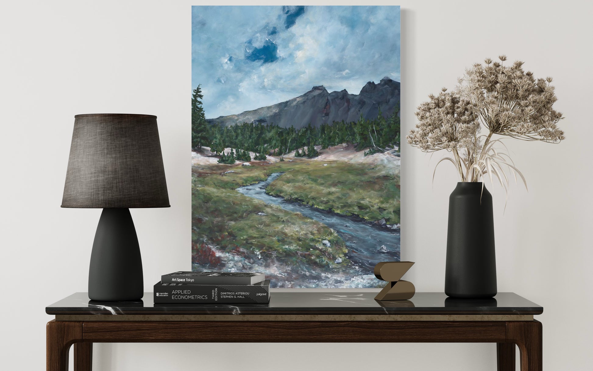 Inspired by a hike with my dog under the shadow of Broken Top mountain. We stopped for a snack at this stream crossing, dipping our feet in the water while enjoying the hard earned view.